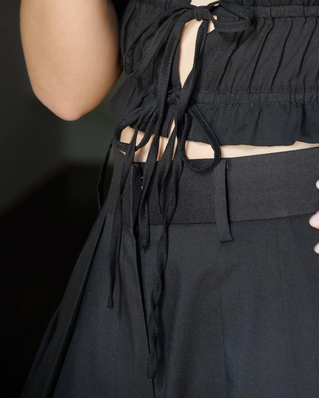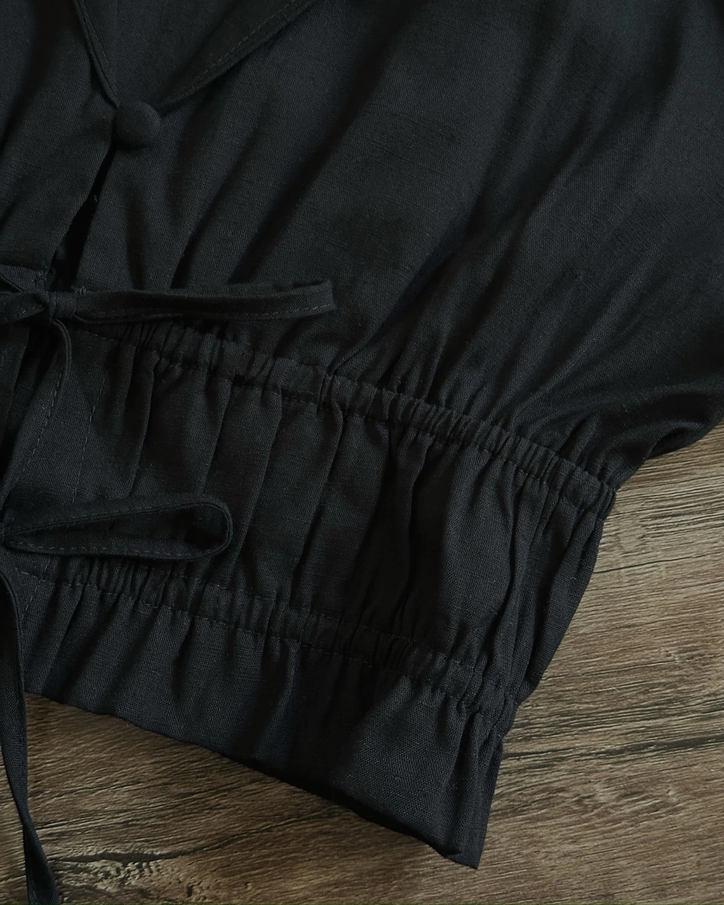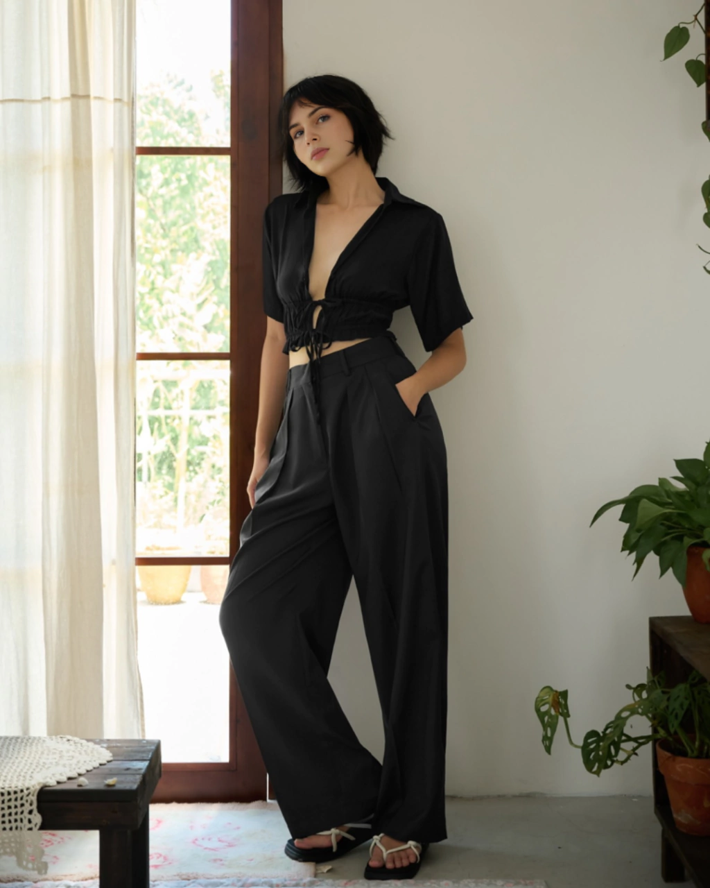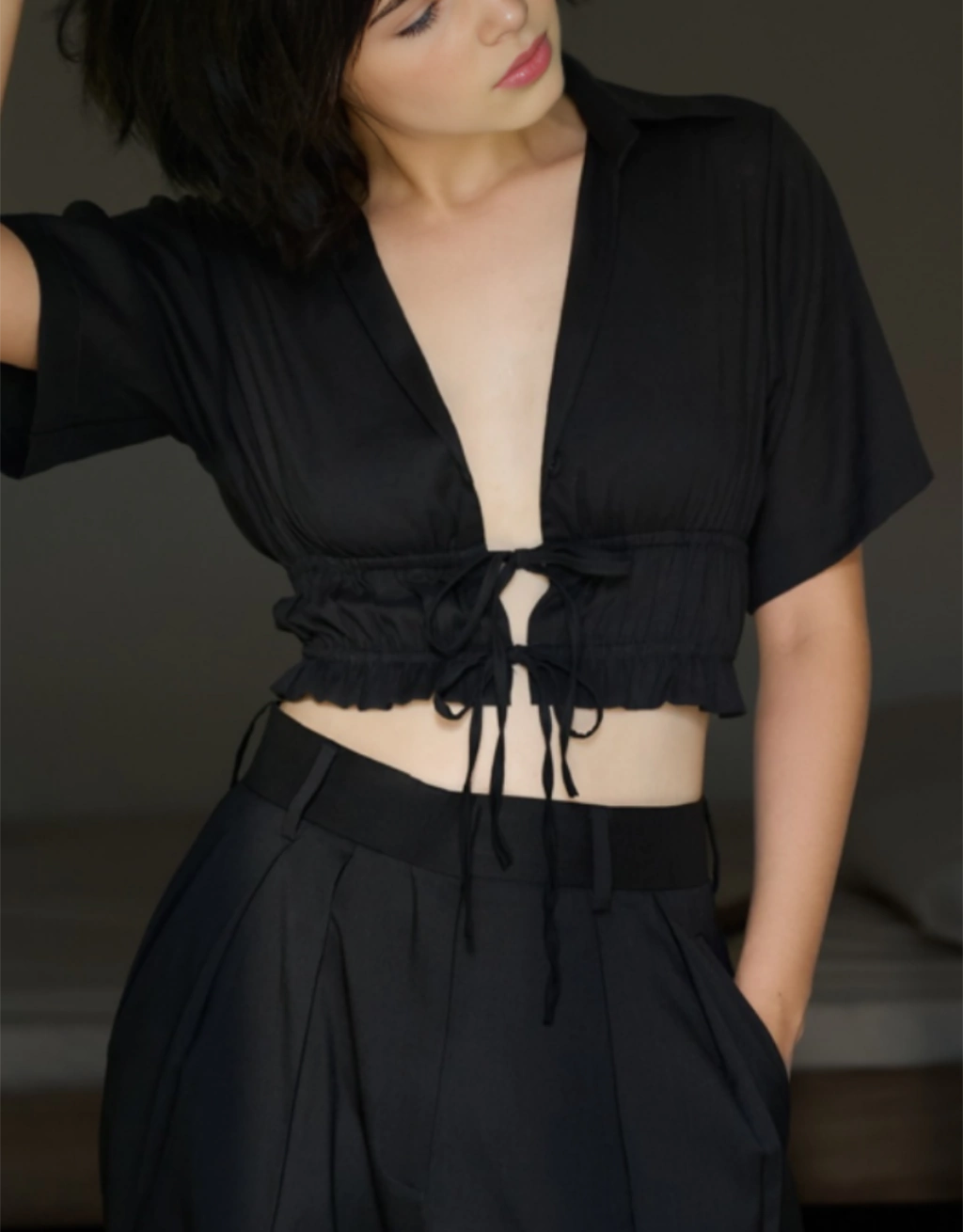 Está confeccionada en algodón fresco de alta calidad, con un corte ajustado que acentúa la silueta sin perder comodidad. El frente cruzado con doble nudo funcional permite regular el escote a tu gusto, y el fruncido bajo el busto aporta textura y estructura.