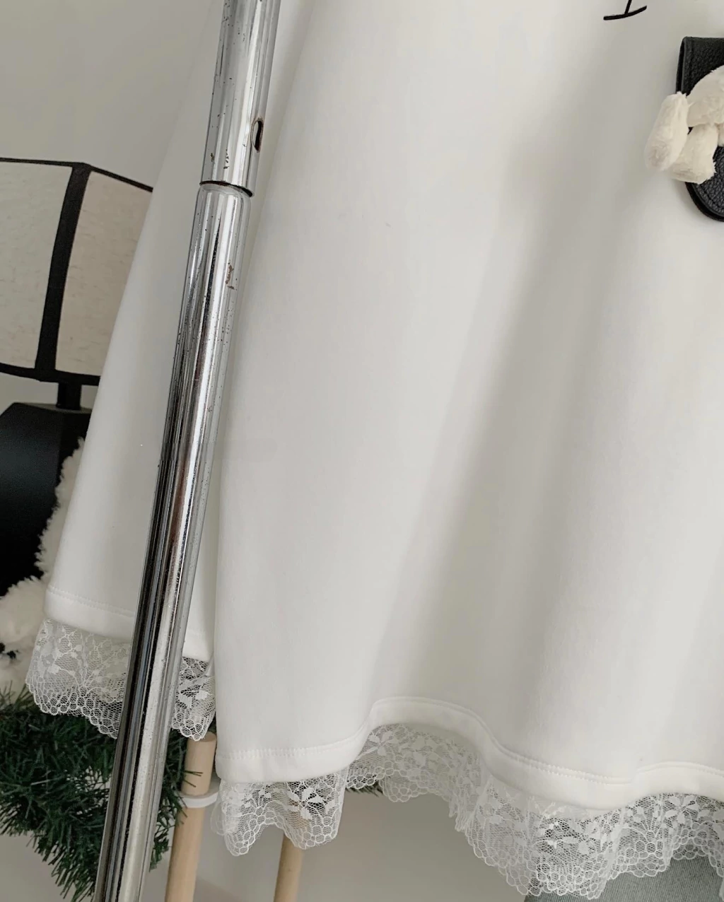 Descubre este lindo conjunto de dos piezas que combina un camibuzo blanco de algodón con un delicado estampado frontal y detalles en encaje, aportando un diseño único y femenino. Su horma grande garantiza comodidad total.