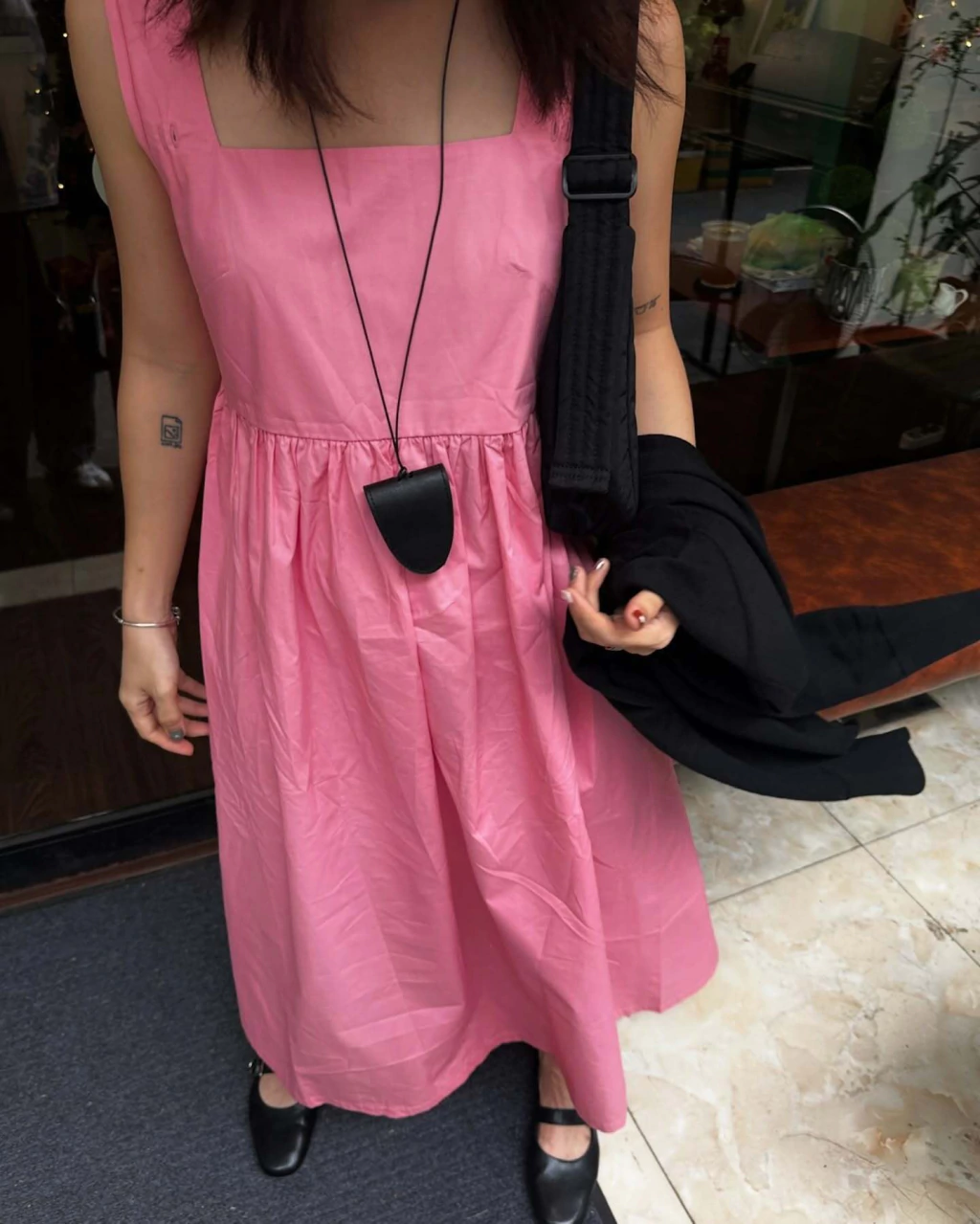Este vestido de horma cuadrada en un delicado color rosado es perfecto para cualquier ocasión. Con tira ancha y confeccionado en popelina, un material delgado pero no transparente, ofrece comodidad y estilo sin importar el clima. Su tela rígida facilita el planchado y lavado, manteniendo siempre su forma.